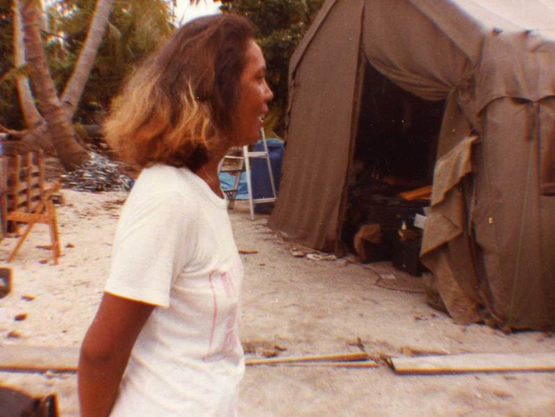 On décharge le matériel dans des conditions chaotiques car le platier récifal n’est pas plat, et les engins prévus pour le débarquement souffrent. La masse de matériel débarqué est stockée haut sur la barrière mais vers 5 heures du soir, une tempête se lève et il faut remonter ces dizaines de tonnes de matériel encore plus haut sur l’atoll pour les sauver car le niveau de la mer monte énormément. Quand ce fut fini, ayant eu le temps lors de la première visite à Nukutipipi de choisir sur l’atoll une zone propice au campement, nous sommes partis dans la nuit sous la pluie battante et un vent violent, avec notre matériel de campement chargé sur le chariot élévateur vers la zone choisie. Je me rappelle que dans ces conditions climatiques extrêmes, et à la seule lumière du chariot élévateur, ce fut très difficile de monter les tentes. Et ce n’est qu’a 2 heures du matin que nous pûmes nous mettre à l’abri sous nos tentes.